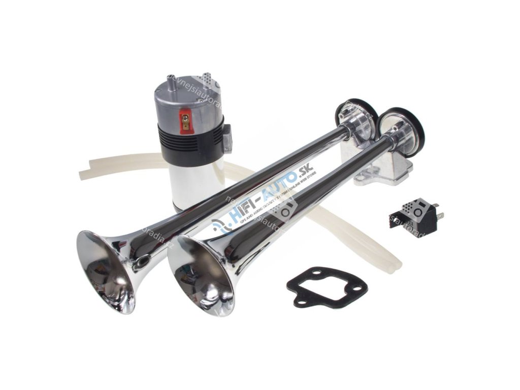 2-trubková fanfára poháněná vzduchovým kompresorem dodávaným v sadě. Trubky jsou vyrobeny z velmi odolné zinkové slitiny a povrch je pochromován.