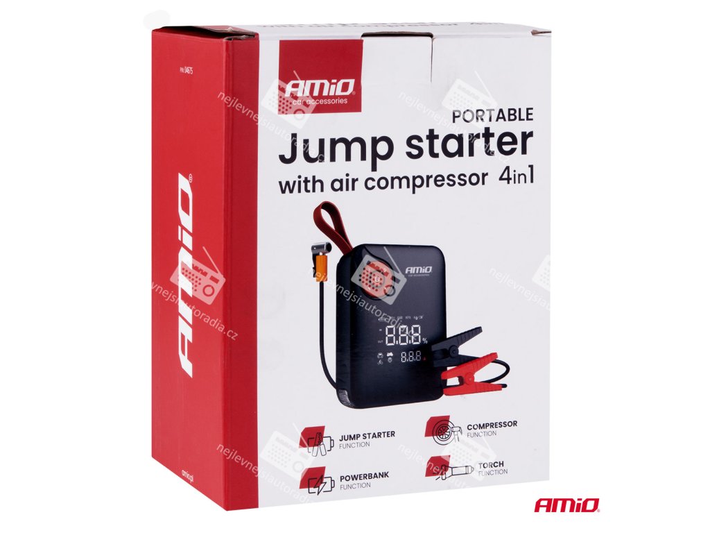 Startovací adaptér AMiO Mini 4 v 1 je kompaktní a všestranné zařízení, které kombinuje funkce startovacího adaptéru, vzduchového kompresoru, powerbanky a LED svítidla. Navzdory svým malým rozměrům nabízí plnou funkčnost a vysoký výkon, díky čemuž je vhodný pro dílnu i každodenní použití.