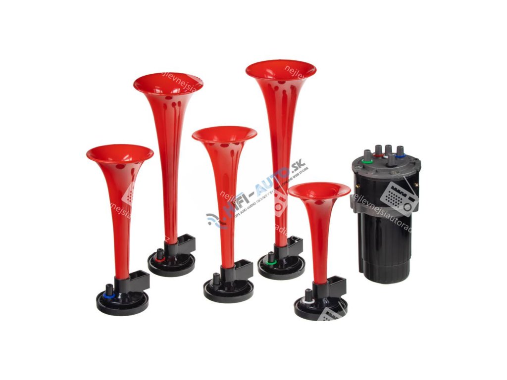 5-trubková fanfára poháněná vzduchovým kompresorem dodávaným v sadě. Trubky jsou vyrobeny z červeného plastu ABS.