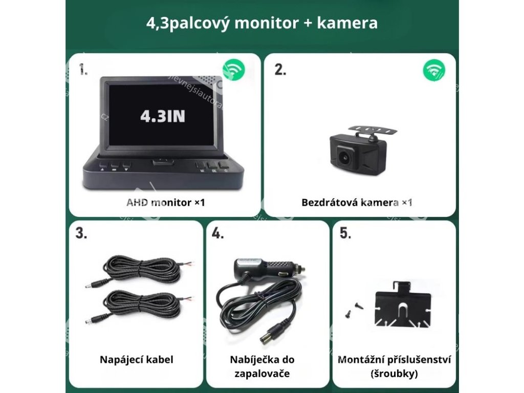 • Sada obsahuje 4,3palcový LCD monitor a kameru, která využívá bezdrátový digitální přenos signálu, což zaručuje vysokou kvalitu obrazu bez rušení a výpadků.