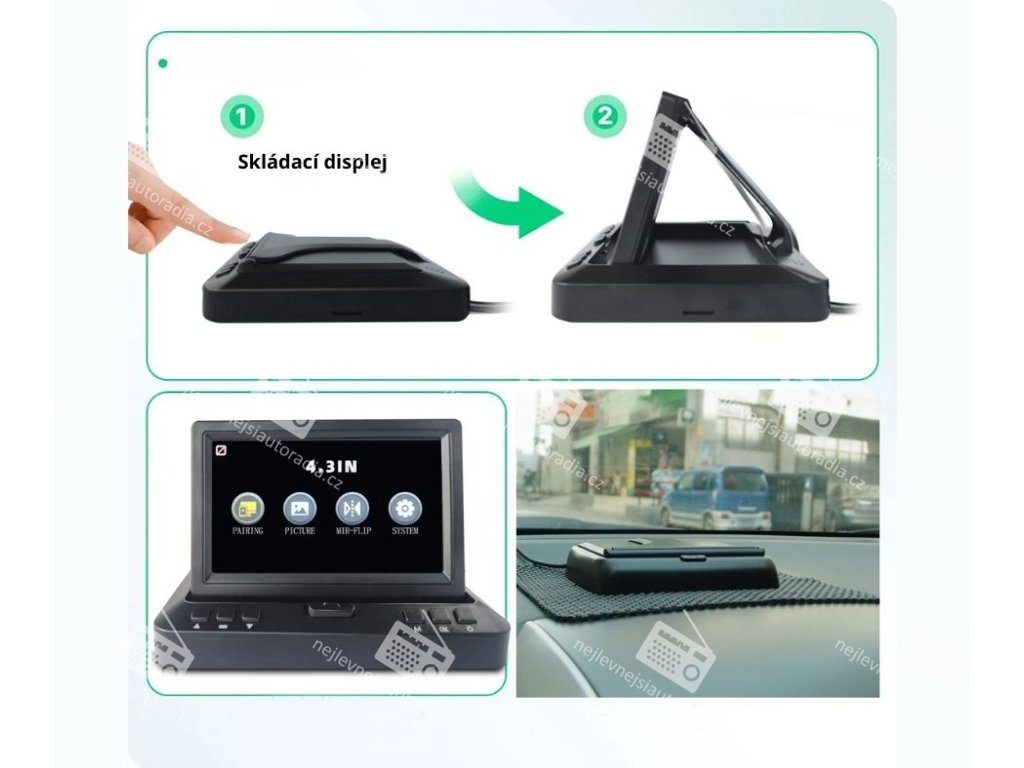 ● Monitor 4,3" – skládací design, rozlišení 480×272, jas 300 cd/m²