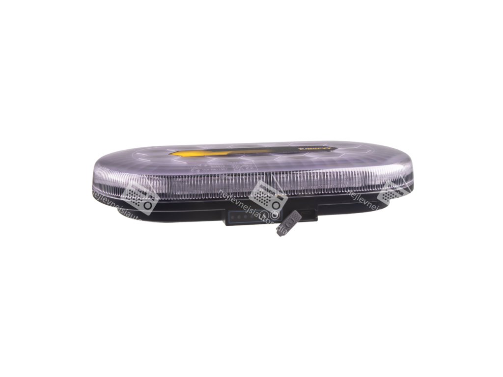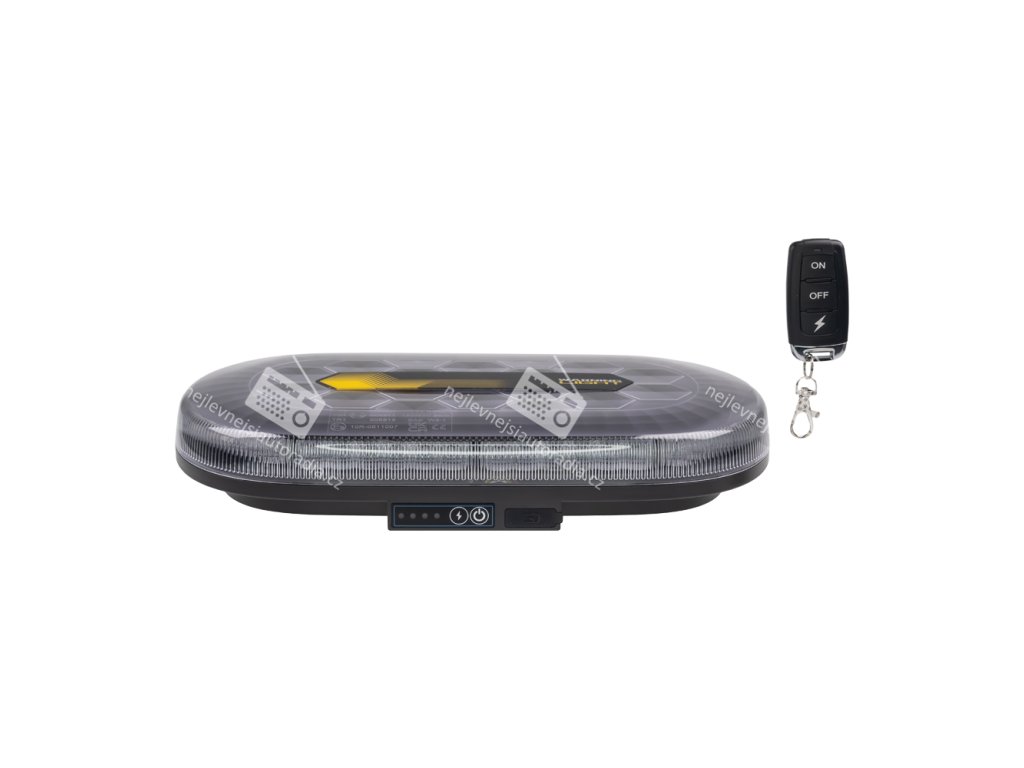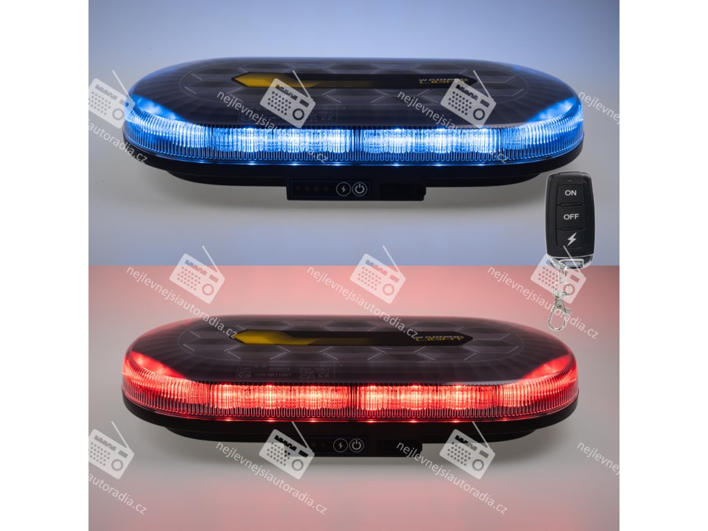 Akumulátorová nabíjecí miniaturní výstražná modročervená LED světelná rampa s různými režimy blikání a dálkovým ovladačem. Určena pro uchycení pomocí magnetu.