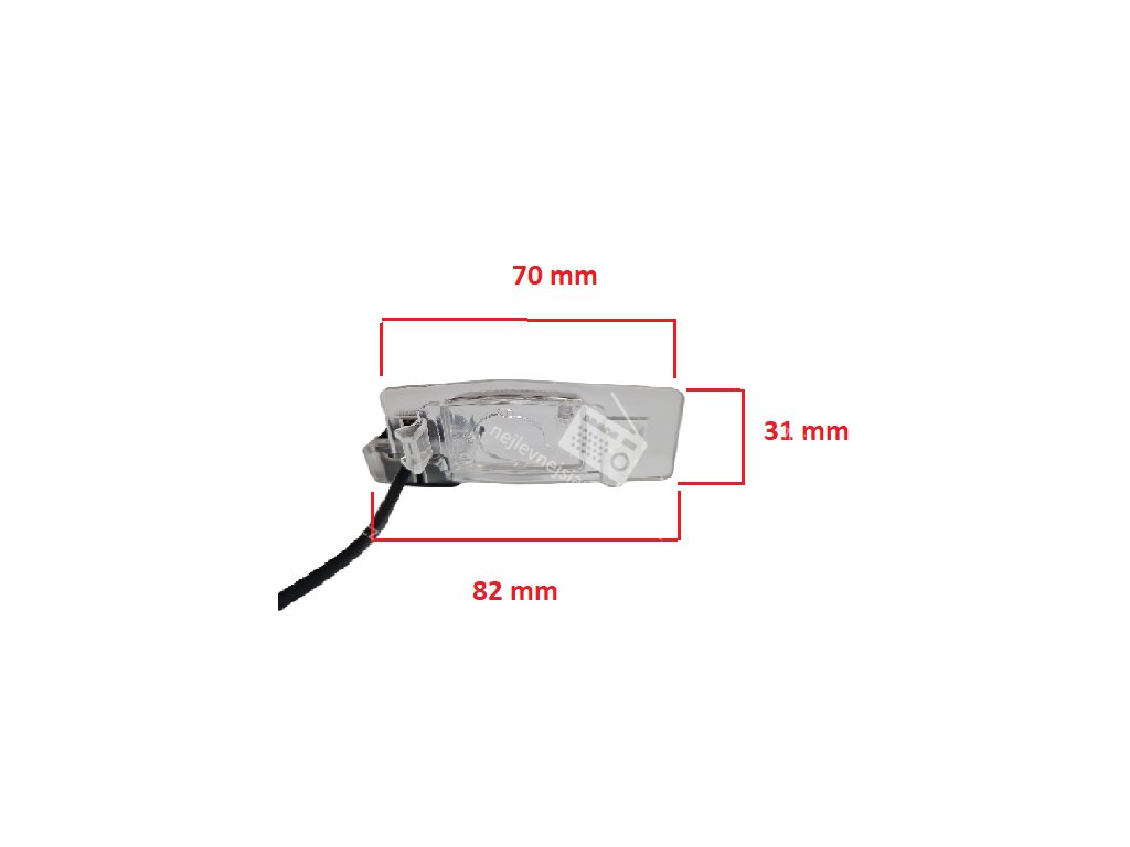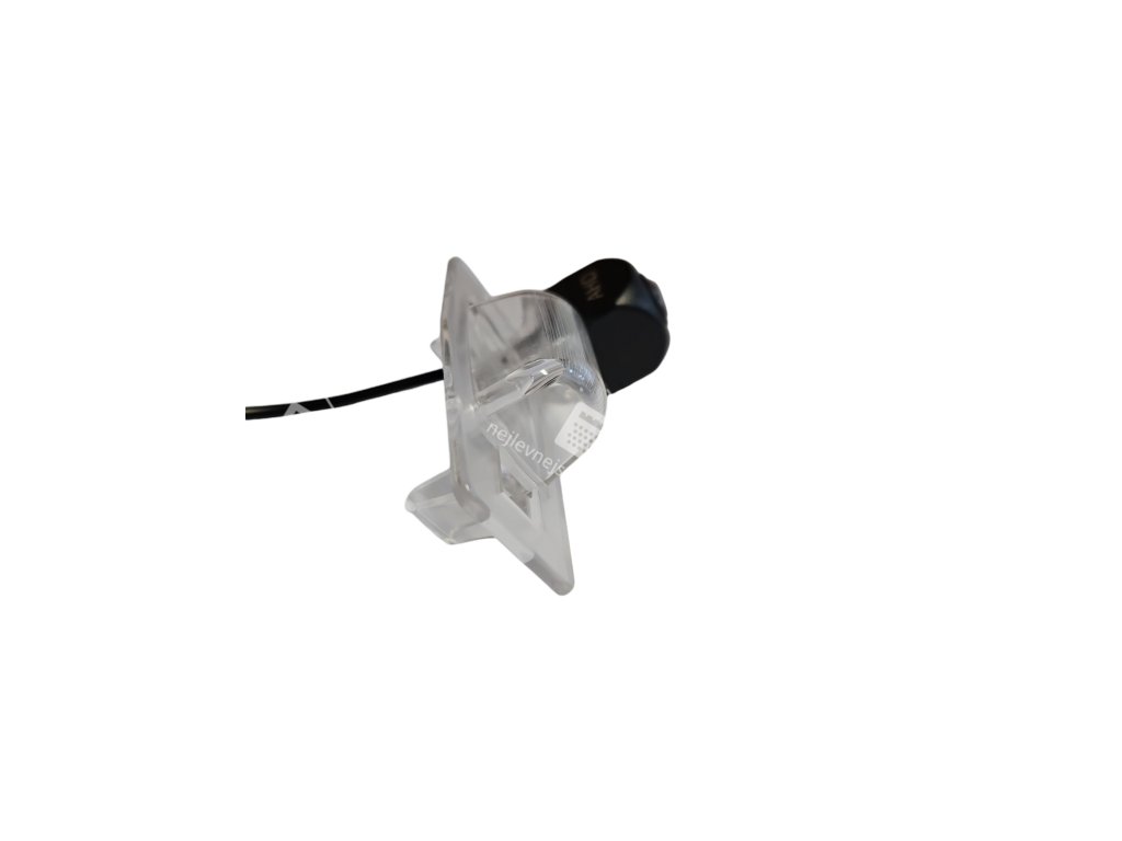 Barevná couvací kamera s nočním viděním pro nahrazení osvětlení SPZ. Je určena pro zabudování do osvětlení nad zadní registrační značku. Jednoduše se vymění za původní osvětlení EVČ. Kamera zároveň zobrazuje pomocné trajektorie pro parkování. Výhodou kamery je zabudované noční vidění. Pro originální design zapadne přímo na určený model automobilu. Disponuje velkým 170° úhlem. Video signál z kamery je vyveden na 6m kabelu s RCA koncovkami.