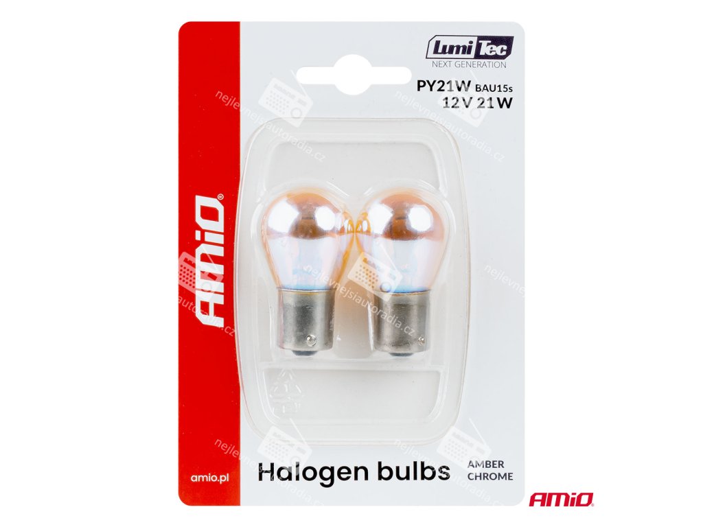 Halogenové žárovky LumiTec PY21W 12V 21W AMBER CHROME jsou vysoce kvalitní směrová světla s chromovým povlakem a jantarovým světlem. Díky technologii AMBER CHROME mají žárovky elegantní stříbrný vzhled a po zapnutí vyzařují intenzivní jantarové světlo, které splňuje předpisy ECE.