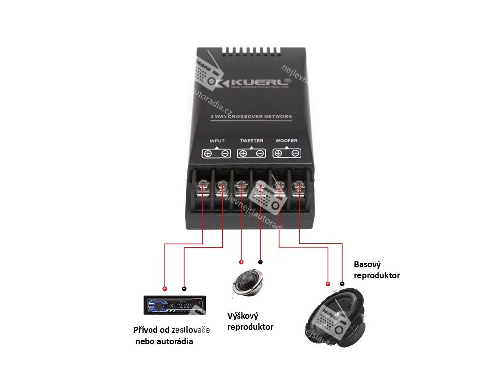 Odděluje vysoké a střední/basové frekvence mezi dva reproduktory