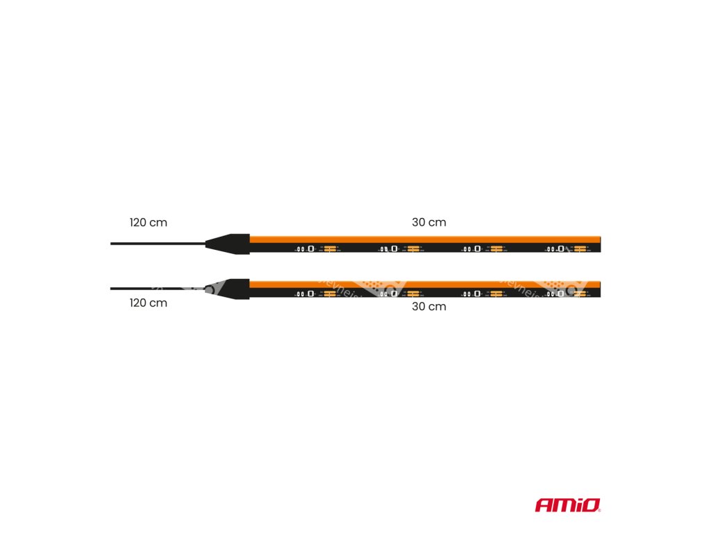 Flexibilní LED pásky určené pro boční montáž ve vozidlech s 12V systémy. Sada obsahuje dva 30cm pásky vyzařující intenzivní jantarové světlo. Jejich flexibilní design umožňuje snadné přizpůsobení montážnímu povrchu. Produkt je vybaven funkcí „vyzkoušejte mě“ pro demonstrace v prodejním místě.