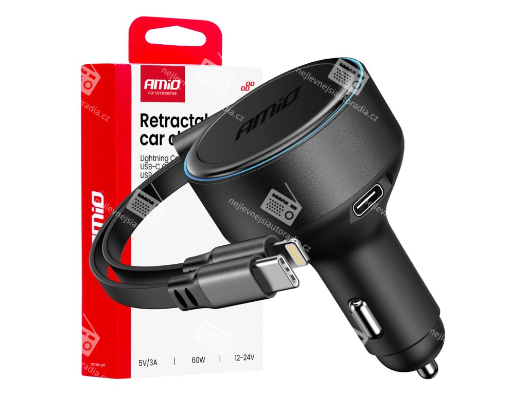 Moderní a funkční nabíječka do auta s výsuvným 70 cm kabelem, která umožňuje pohodlné a rychlé nabíjení mobilních zařízení na cestách. Díky integrovaným kabelům USB-C a Lightning a dalšímu portu USB-C umožňuje současné nabíjení tří zařízení s maximálním výkonem 60 W.