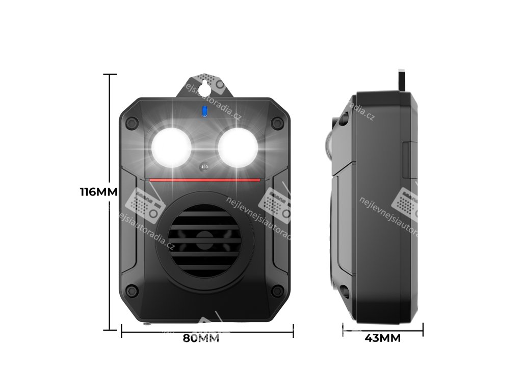 Obsahuje spínač a LED kontrolku na ruční zapnutí a vypnutí plašičky.
