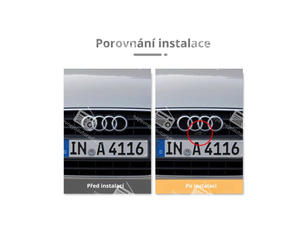 Barevná parkovací kamera přední. Je určena pro zabudování do přední masky vozu Audi A4 2008-2016. Vhodné např. pro kombinaci s monitorem, nebo s adaptéry pro připojení k originální navigaci. Kamera zároveň zobrazuje pomocné trajektorie pro parkování.