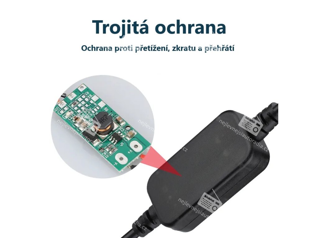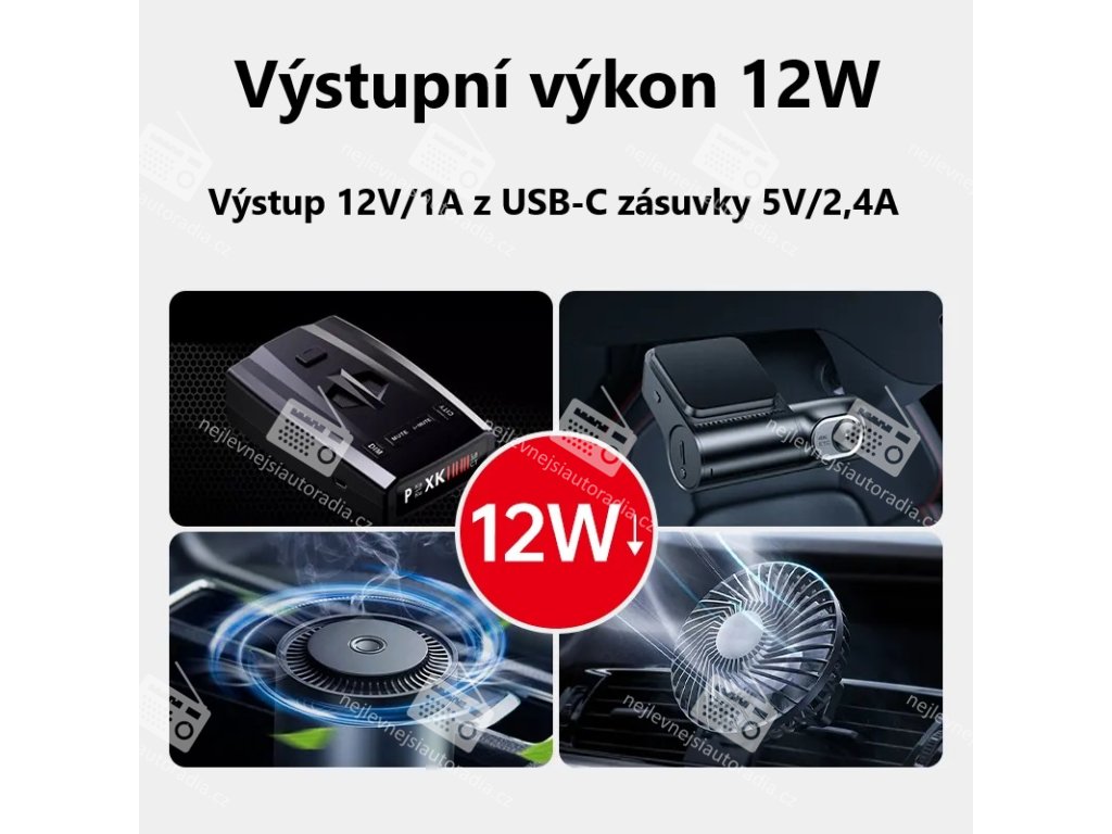 Vhodné např. pro napájení/nabíjení DVR kamer, mobilních telefonů, audio zařízení, ventilátorů atd. s maximálním příkonem do 12 W.