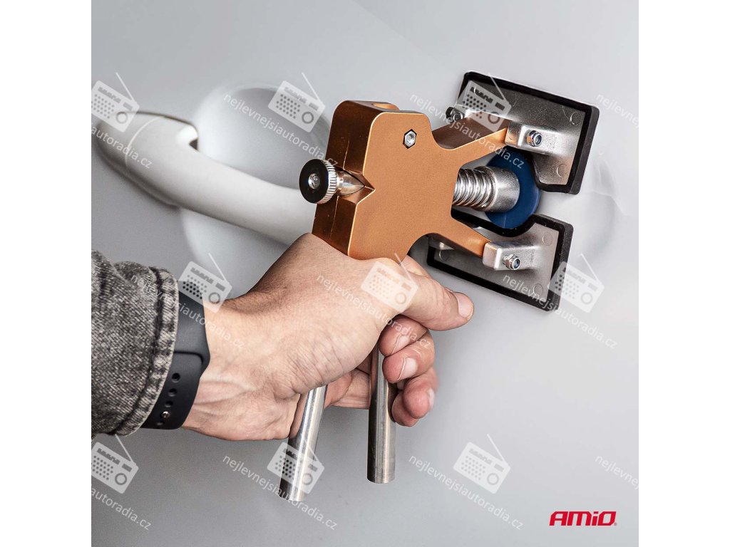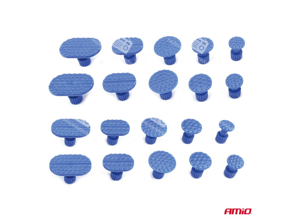 Souprava obsahuje 20 vyměnitelných nástavců („houbiček“) různých průměrů, což zaručuje maximální flexibilitu při práci s různými typy promáčknutí – od malých bodových až po větší plošná poškození. Ergonomické nářadí a pevná konstrukce zajišťují pohodlí při práci a opakovatelně kvalitní výsledky, ať už v profesionální dílně, nebo při domácí opravě auta.