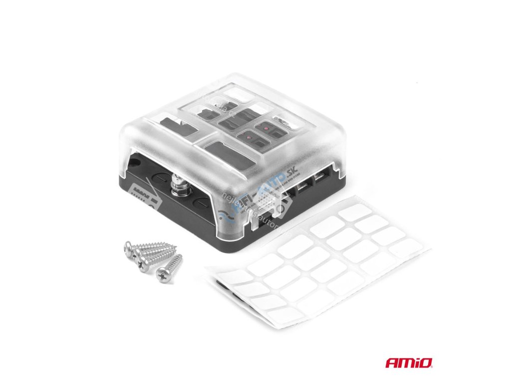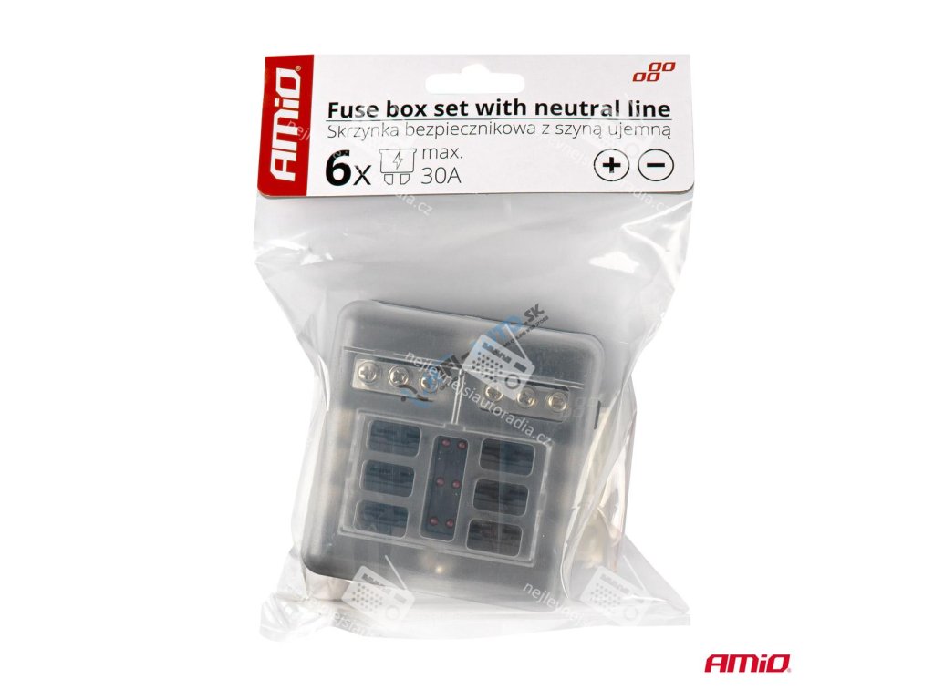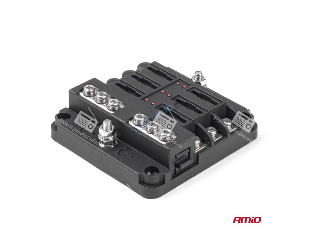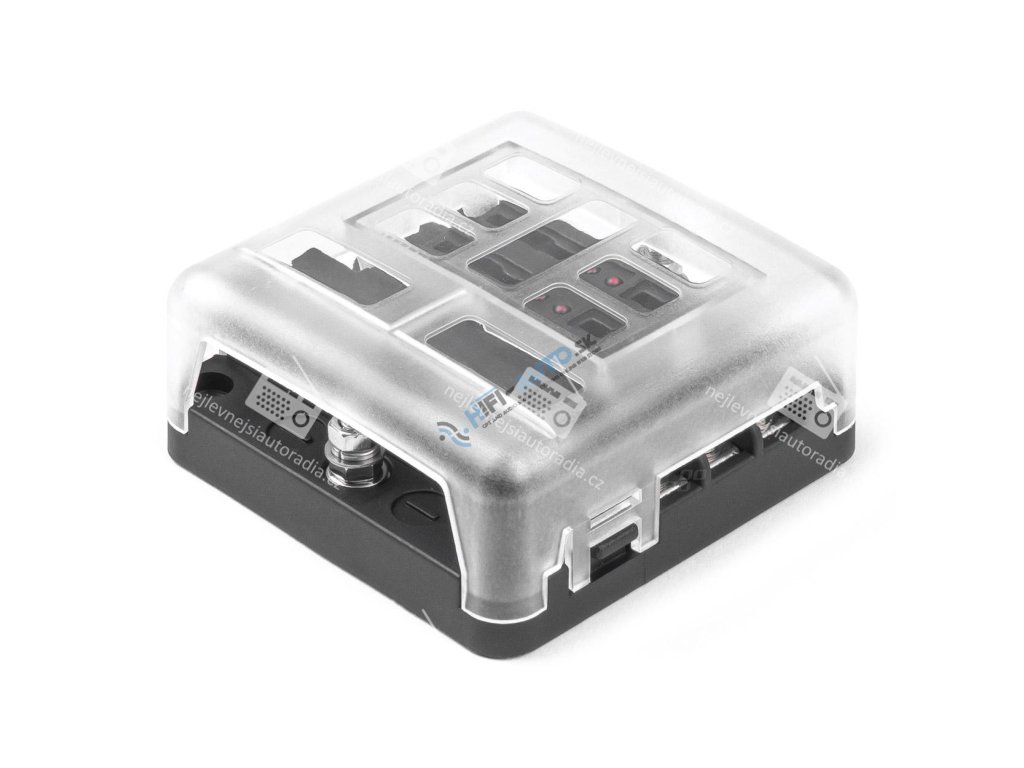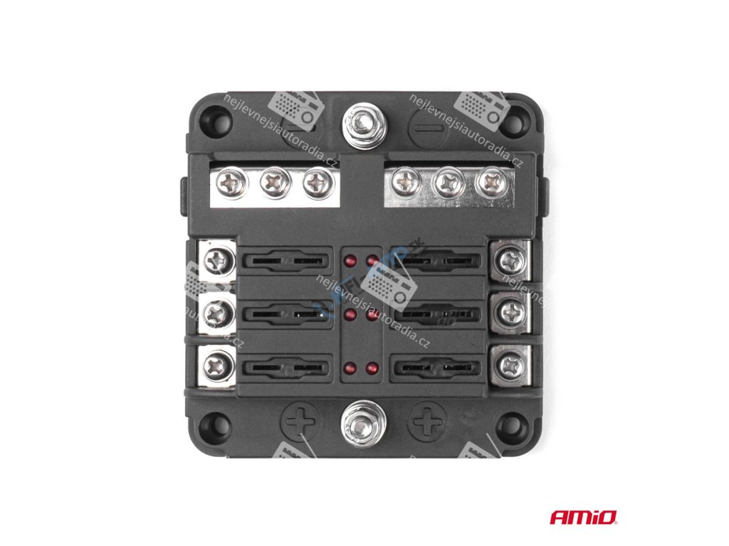 Univerzální 6-obvodová pojistková skříňka plus přídavná uzemňovací sběrnice. V případě přepálení pojistky se u každé zásuvky rozsvítí červená LED dioda, takže rychle a jednoduše zjistíte, který okruh je vadný.