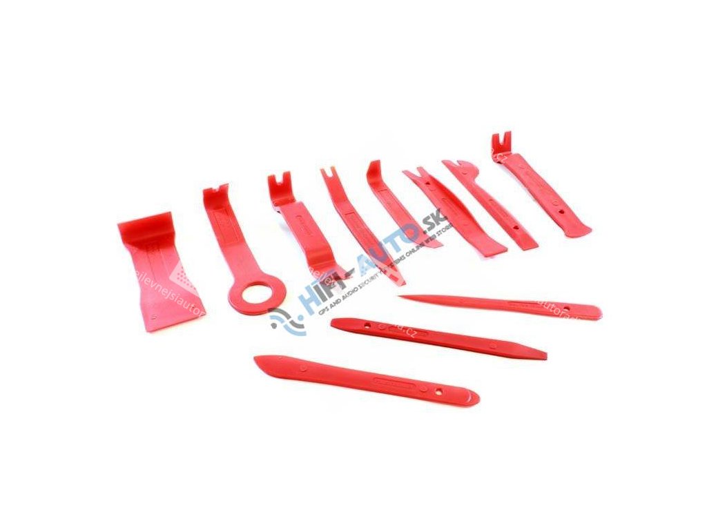 Sada nástrojů určených pro demontáž přístrojové desky a plastových dílů interiéru automobilu. Vyrobeno ze silného PMMA (různé tloušťky a pružnosti).