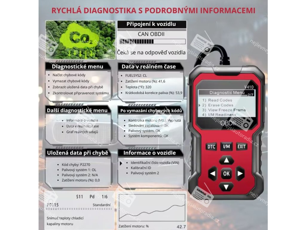 ● Načtení chybových kódů – rychle identifikuje příčinu rozsvícené kontrolky „Check Engine“.