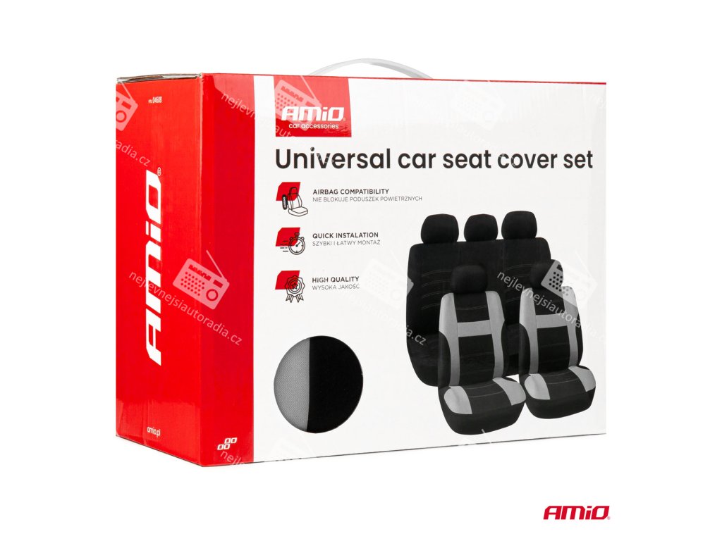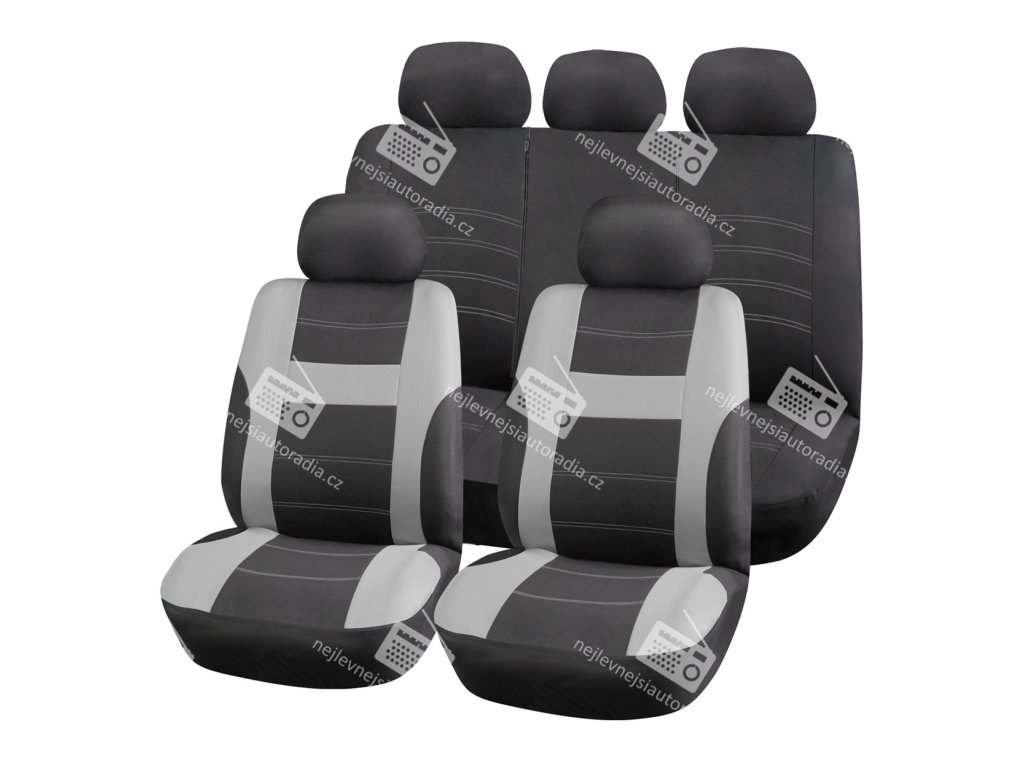 Tato 9dílná sada obsahuje potahy na dvě přední sedadla, dělené zadní sedadlo a kompletní sadu opěrek hlavy. Univerzální sada pro většinu modelů osobních automobilů.