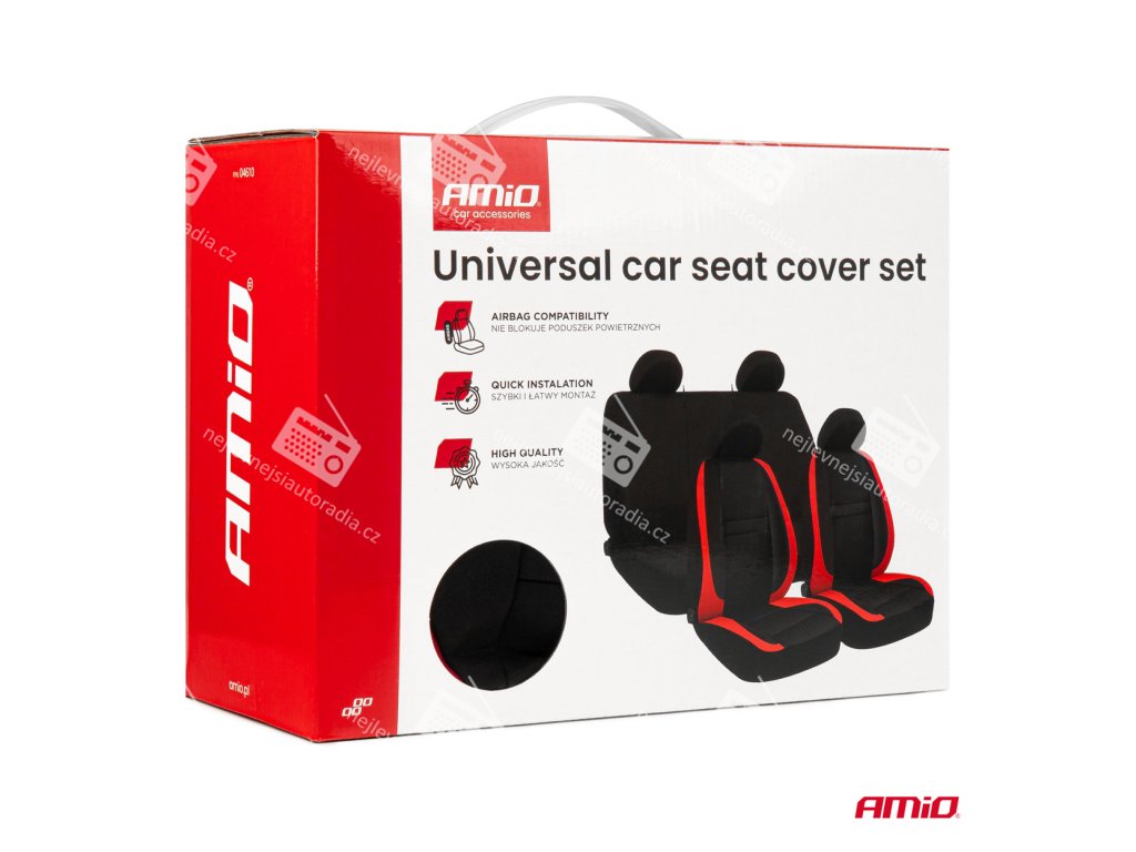 Tato 9dílná sada obsahuje potahy na dvě přední sedadla, dělené zadní sedadlo a kompletní sadu opěrek hlavy. Univerzální sada pro většinu modelů osobních automobilů.