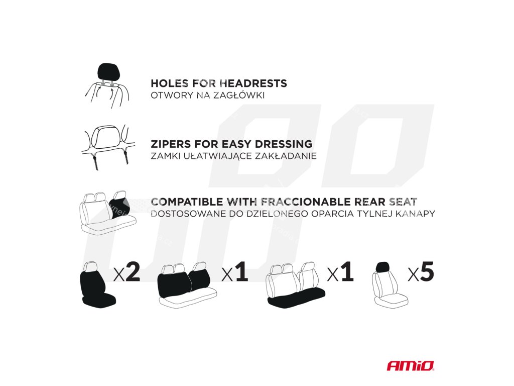Tato 9dílná sada obsahuje potahy na dvě přední sedadla, dělené zadní sedadlo a kompletní sadu opěrek hlavy. Univerzální sada pro většinu modelů osobních automobilů.