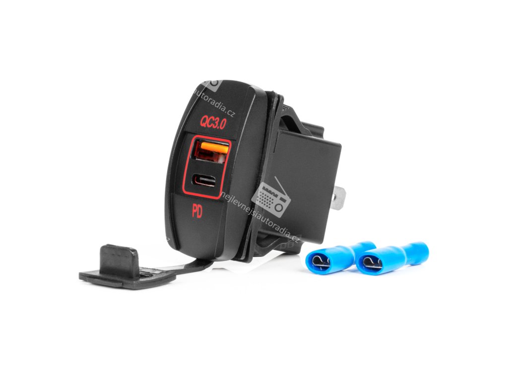 Vodotěsná nabíječka na telefon ve tvaru lodi s ČERVENÝM LED podsvícením USB + USB C QC3.0 12/24V
