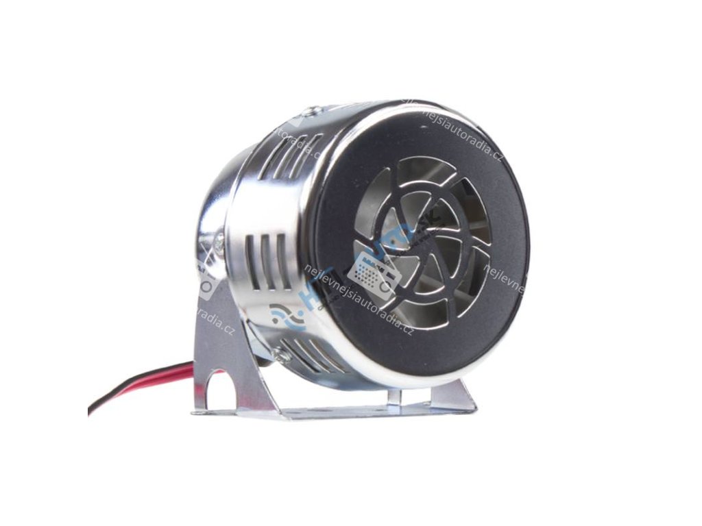 Vzduchová siréna 12V. Jedná se o velmi hlasitou sirénu o intenzitě 110 dB! Tato siréna je poháněna motorem a poskytuje autentický a velmi hlasitý zvuk. Siréna má odolnou kovovou konstrukci s chromovaným povrchem a má velmi malé rozměry, ideální pro montáž v těsných prostorách. Určeno pro použití pro osobní automobily, nákladní automobily, SUV, dodávky, čluny, traktory, motocykly a čtyřkolky s 12V napájecím systémem!