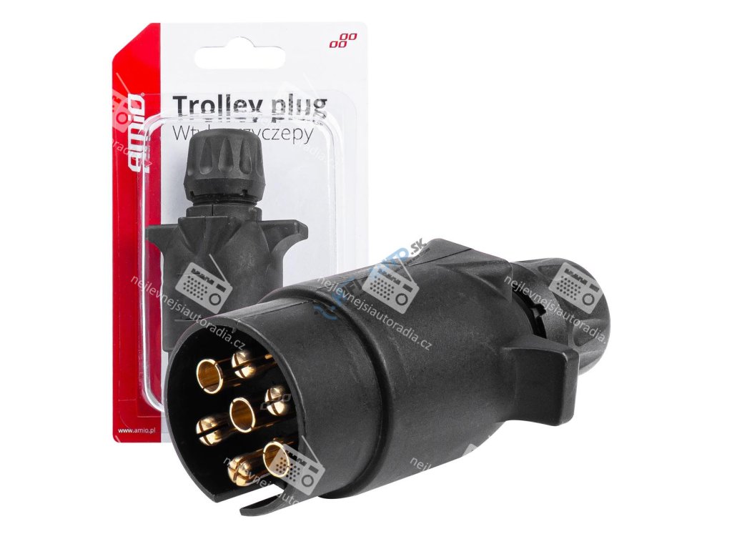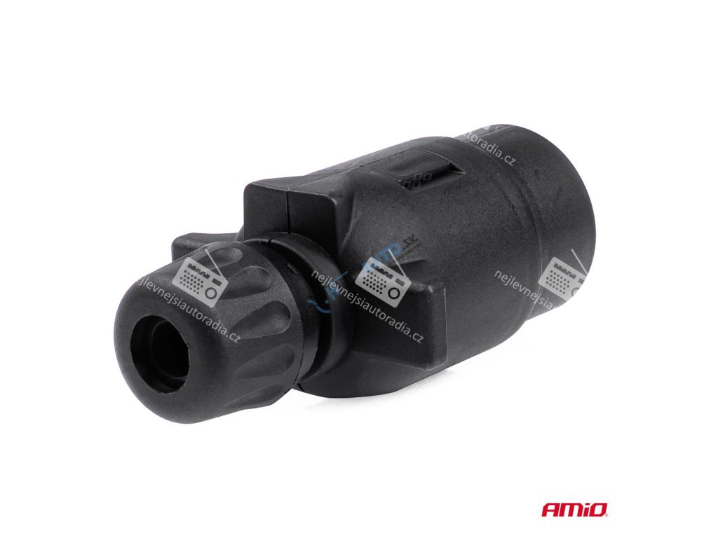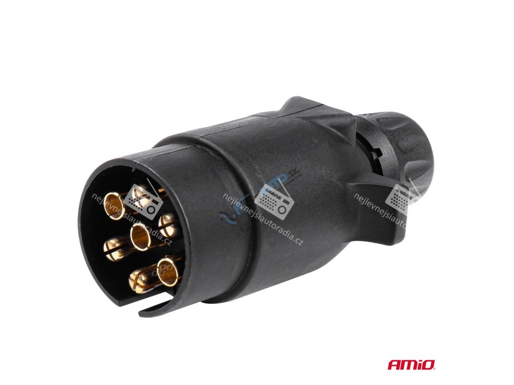 Plastová 7-pinová zástrčka přívěsného vozíku určená pro 12V i 24V elektroinstalaci.