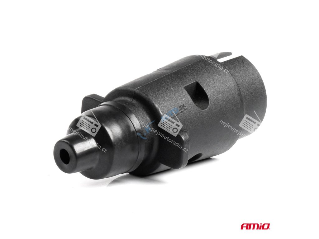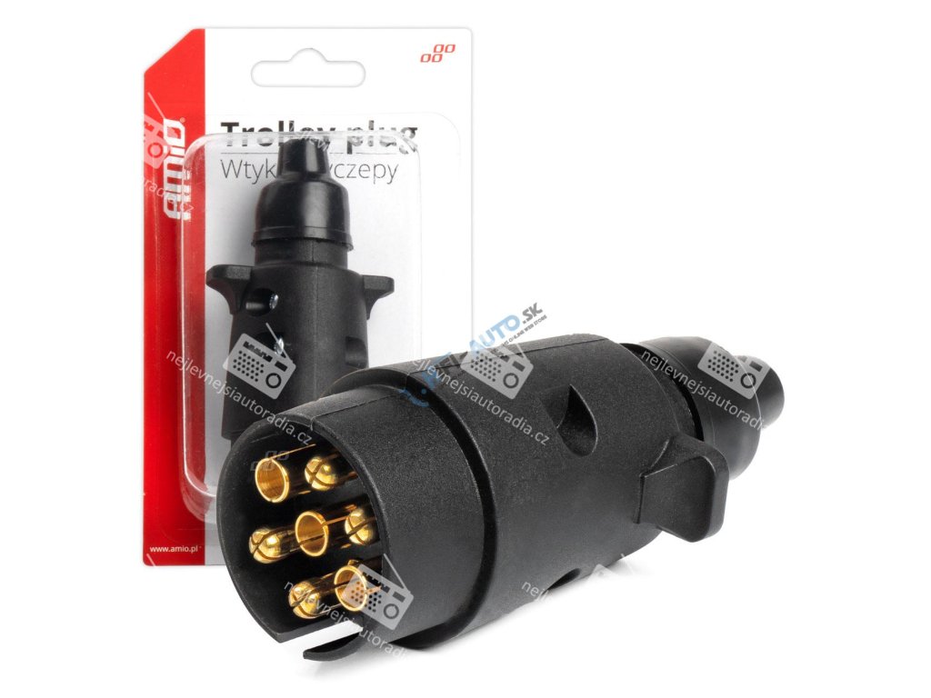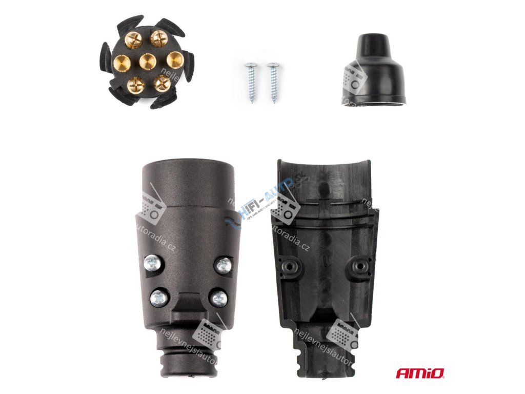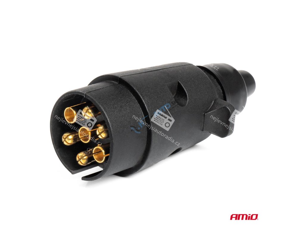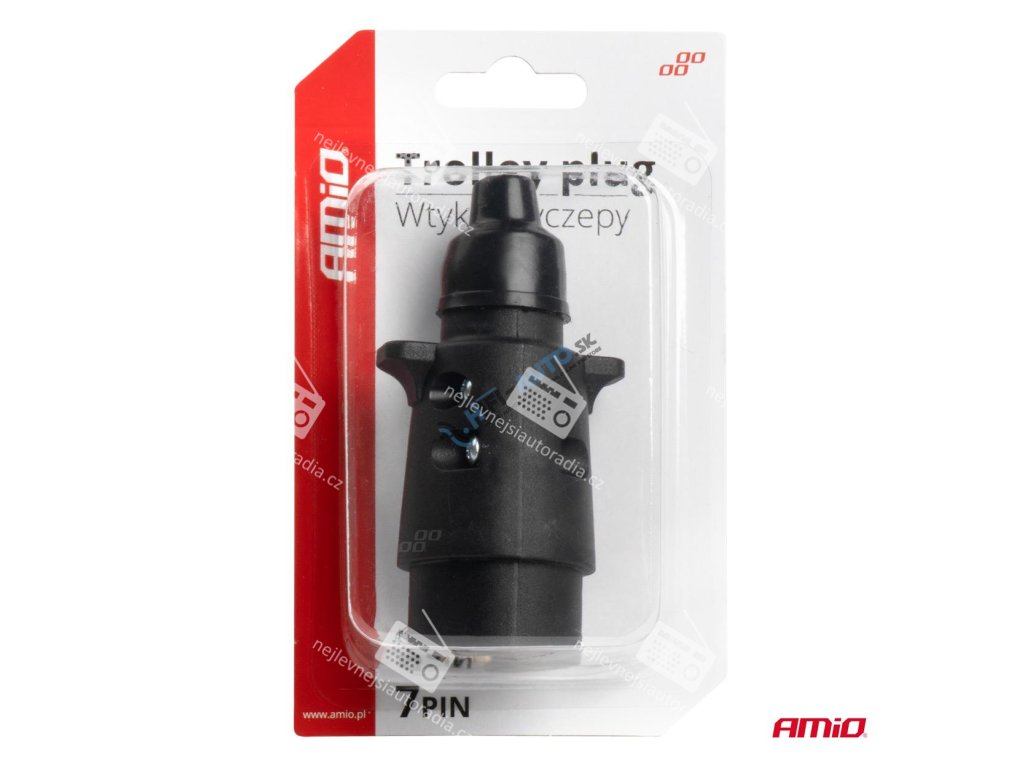 Zástrčka přívěsu 7 - Kolík, zkroucený. Univerzální zástrčka, pasuje na jakýkoli typ přívěsu nebo odtahového vozidla. Kryt zástrčky je vyroben z velmi odolného PVC materiálu, díky čemuž je odolný vůči poškození. Má kovové kolíky, které jsou chráněny proti rezivění. Zástrčka je proto ideální pro jakýkoli přívěs, který bude často zaparkován, například na dvoře. Velice snadno se instaluje a zajišťuje trvalé spojení elektrického systému přívěsu s automobilem, což zaručuje nepřetržitý provoz všech světel během jízdy.